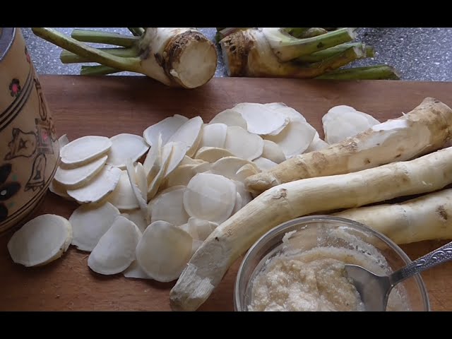 Собирать растения, как корневище, так и листву, принято не раньше, чем на 2-3 год жизни. Молодые растения не имеют нужной «крепости», остроты и пикантности. Чрезмерно старые становятся менее насыщенными, приобретают деревянистый вкус и сильно волокнистую структуру. Копать корни принято осенью, примерно в сентябре-октября, когда они приобретают наибольшую насыщенность. Листья резать допустимо со второй половины июня и до самого конца августа.